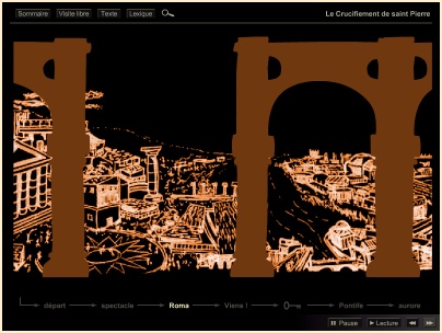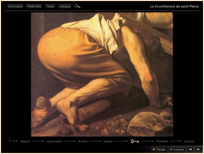 Le Crucifiement de saint Pierre Le grand et le petit triangles nous apparaissent alors comme deux chevrons imbriqués, ouvrant tous deux sur la droite pour amener notre regard vers la prunelle* même de l'Apôtre. Nous observons que le plus vaste triangle (de la croix avec la corde) loge en son centre le triangle du linge comme sa copie réduite et proportionnée. |