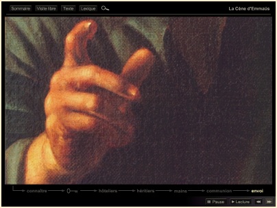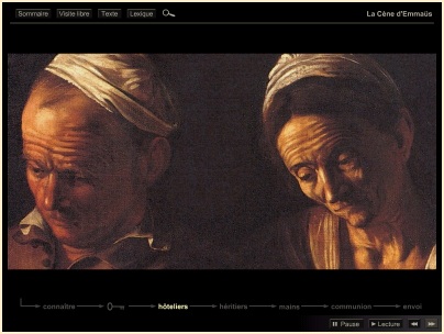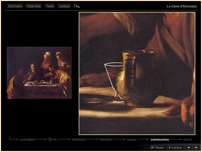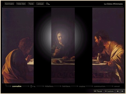 La Cène d'Emmaüs Au jour de la Résurrection, les pèlerins d'Emmaüs écarquillent les yeux dans l'aurore du salut où Se révèle à eux, ô Soleil de Justice, le Christ ressuscité! Voici l'heure de grâce : silencieux, immobiles, fixons notre regard sur ce moment précis... A la clarté pascale de l'Epoux divin, l'humanité s'éveille comme d'un long sommeil où la tenait captive le Prince mondain! Notre présente toile est comme impressionnée, photographiquement, par le rayonnement de cet instant béni... dont le peintre témoigne. |